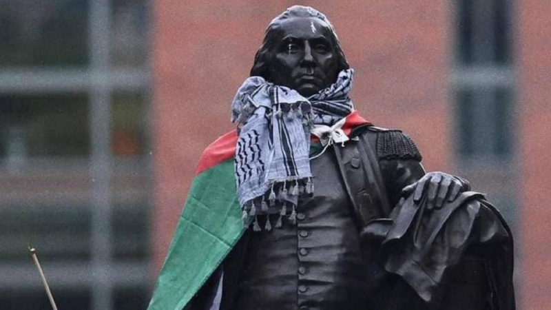 خوێندکارە ئەمریکییەکان کە لە ماوەی چەند ڕۆژی ڕابردوو دا وێرای مانگرتن وبەڕێوەبردنی خۆیشاندان ، دڕندەکارییەکانی زایۆنیستەکانیان ئیدانە و پشتگری واشنگتۆن لە تێل ئابیب یان شەرمەزار کردووە ، لە زانکۆی جۆرج واشنگتۆن ، چەفیە و ئاڵای فەلەستینیان خستە سەر شانی پەیکەرەی ئەم کەسە کە یەکێ لە بناغەدانەرانی ئەمریکایە.